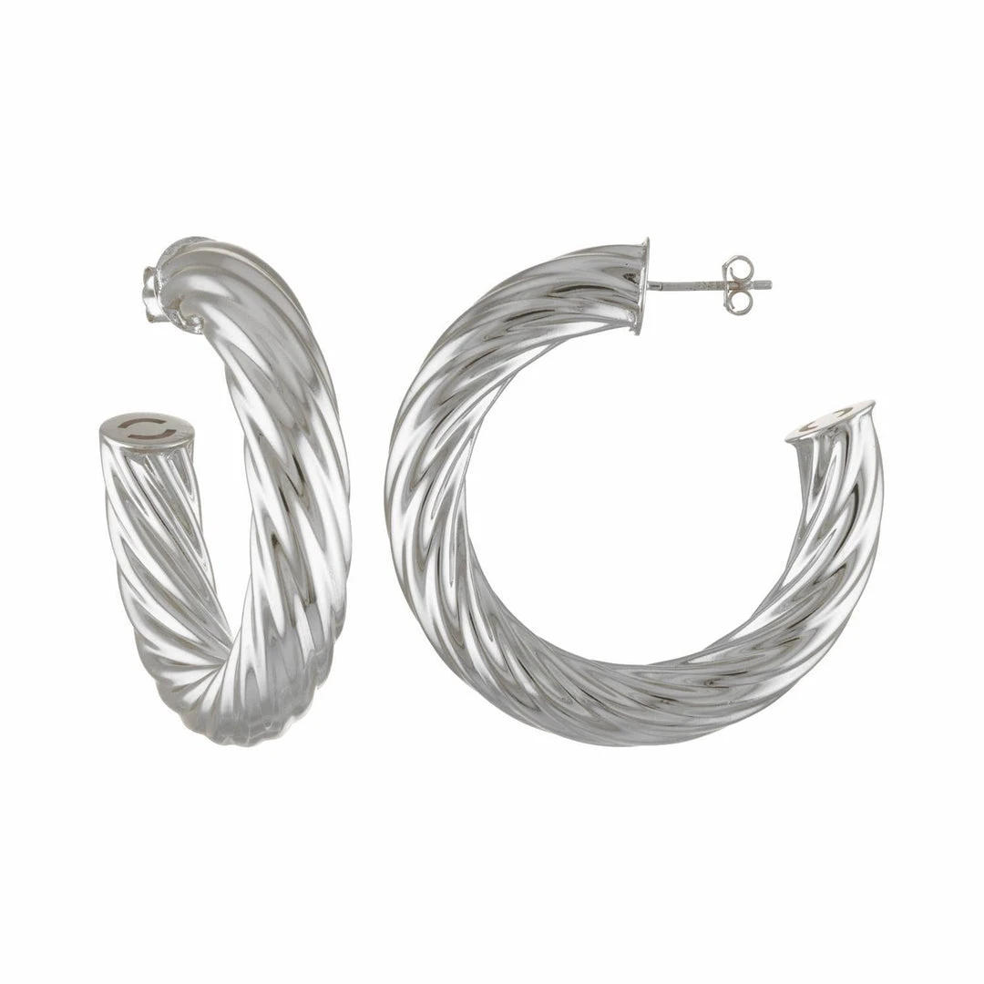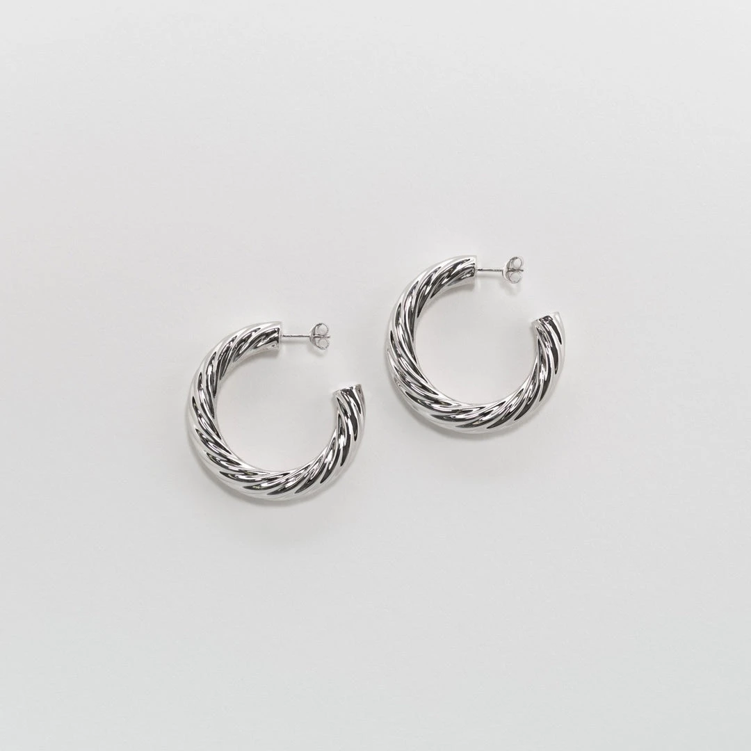 The model wears the 1.5″ Twist Hoops in Gold.Â