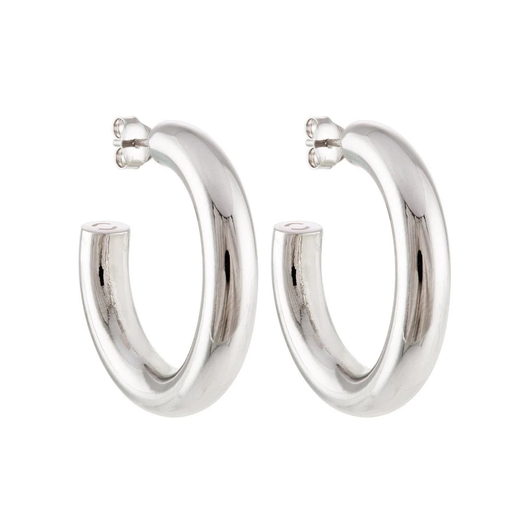 Model is wearing the 1″ Perfect Hoop in Silver.