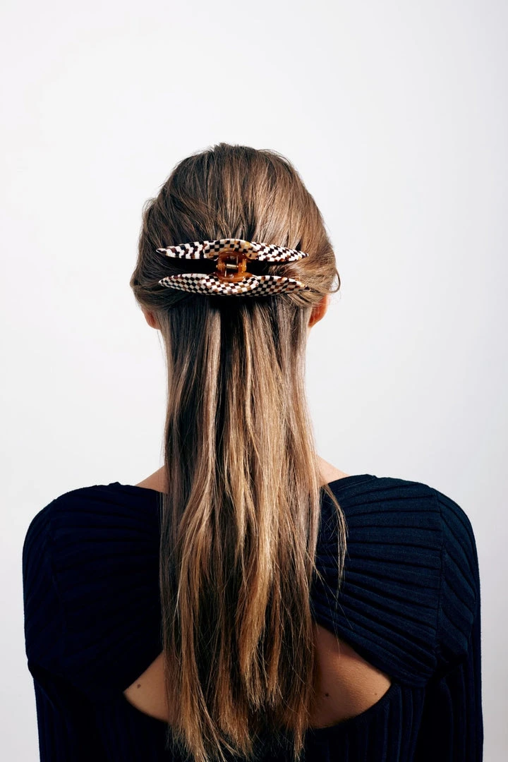 The model wears our Jumbo Heirloom Claw in Tortoise Checker.Â