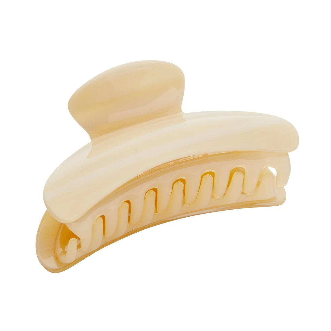 The model wears our Grande Claw in Blonde Tortoise.