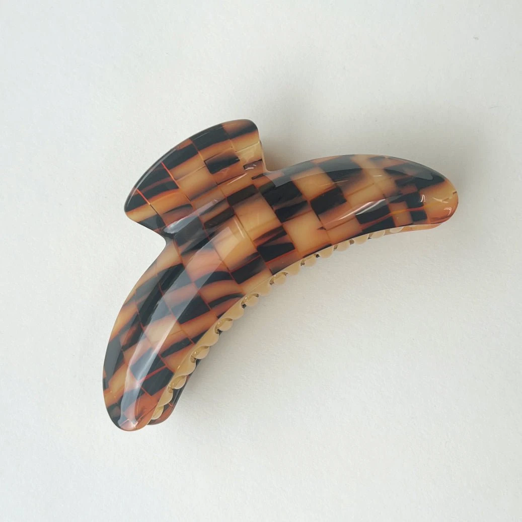 The model wears our Jumbo Heirloom Claw in Tortoise Checker.Â