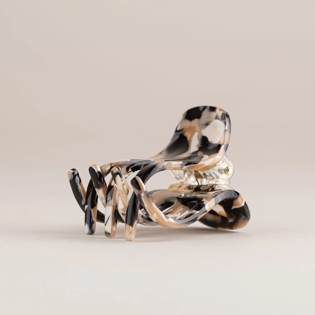 The model wears 2 of our Mini Claws in Canyon Brown.