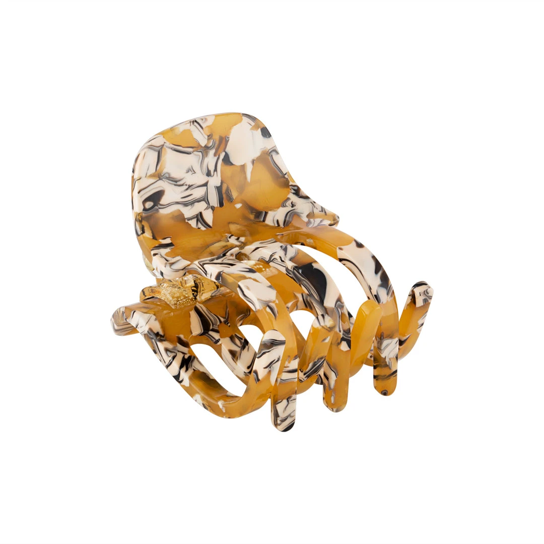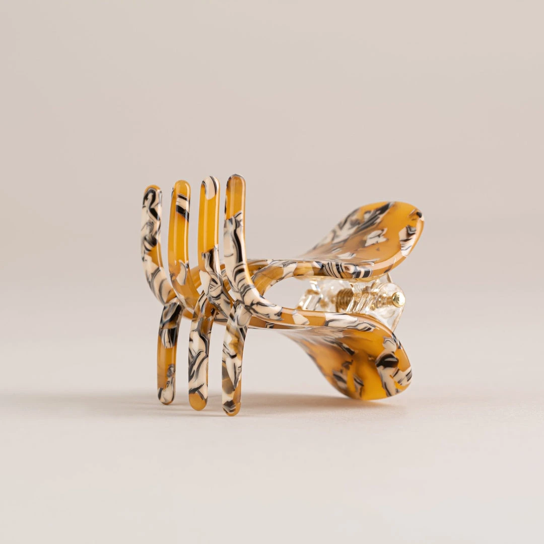 The model wears 2 of our Mini Claws in Canyon Brown.