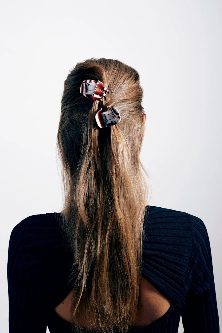 The model wears 2 of our Mini Claws in Canyon Brown.