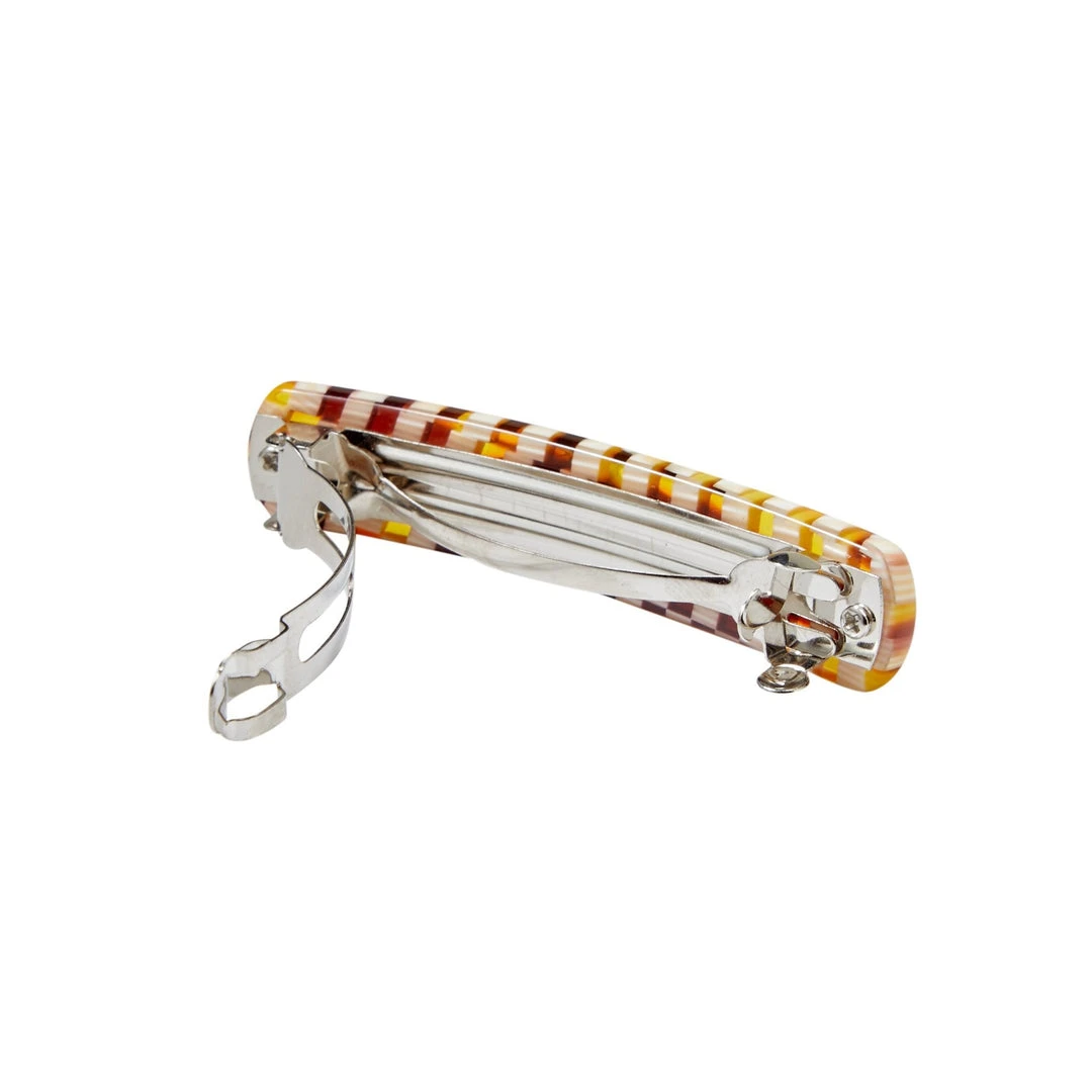 The model wears our (from top to bottom) No. 3 Heirloom Clip in Alabaster, Bizarre Checker, and Cognac.