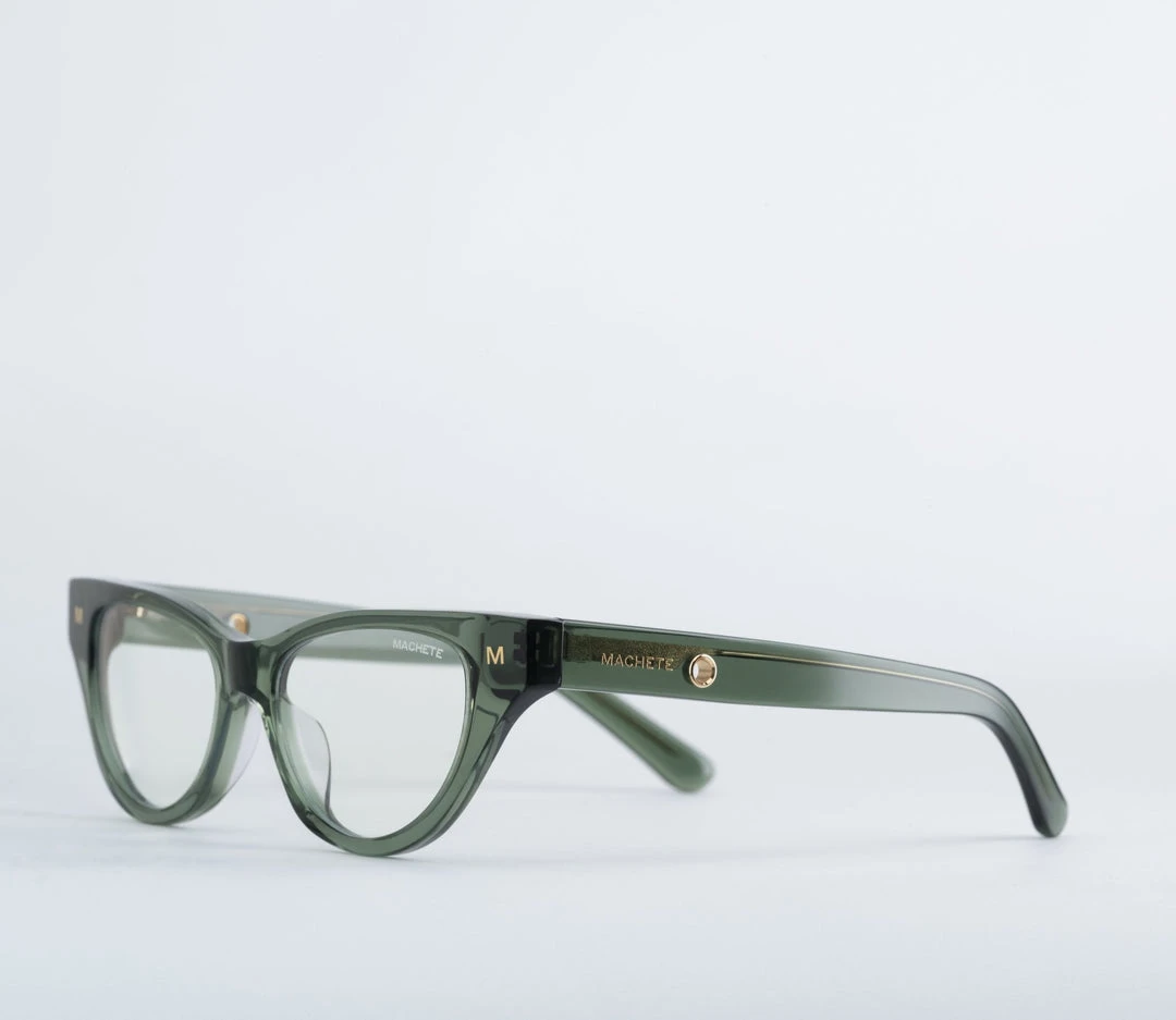 Take any ensemble to the next level with Suzy, our ultra-sleek narrow cat-eye frame. Handcrafted from the most environmentally friendly and highest-quality acetate on the market today to ensure your frames will not only last but be kind to the planet as well. Adorned with a gold Machete logo and hardware as well as a ring for your eyeglass chain at the temples.