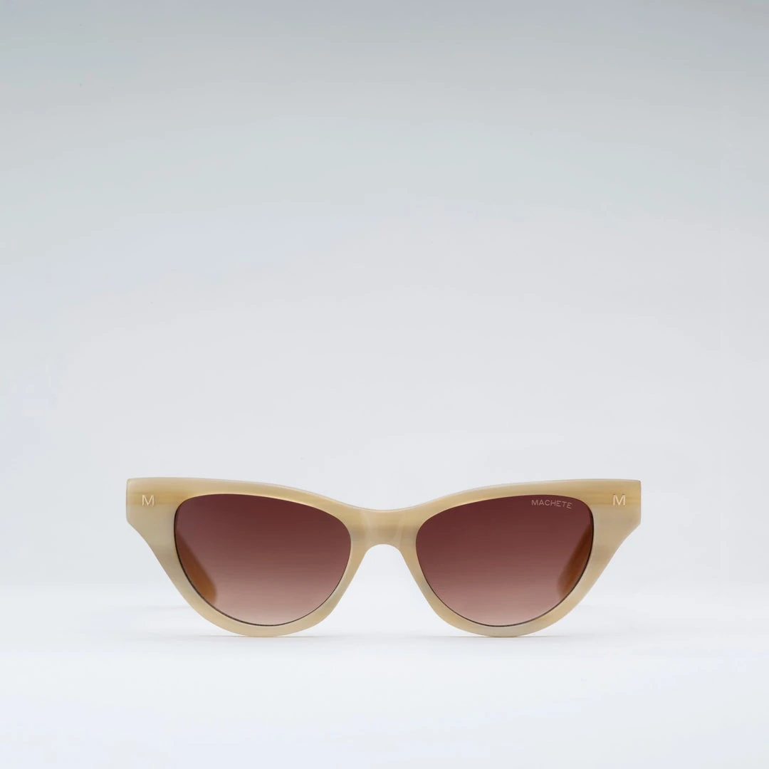 Take any ensemble to the next level with Suzy, our ultra-sleek narrow cat-eye frame. Handcrafted from the most environmentally friendly and highest-quality acetate on the market today to ensure your frames will not only last but be kind to the planet as well. Adorned with a gold Machete logo and hardware as well as a ring for your eyeglass chain at the temples.