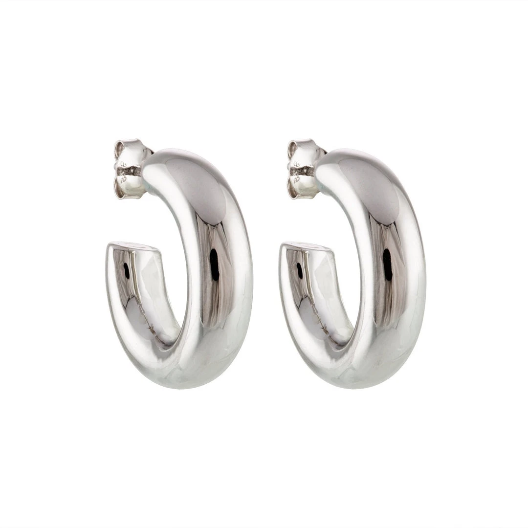 Model is wearing the .75″ Perfect Hoops in Silver and Maya Hoops in Gold.