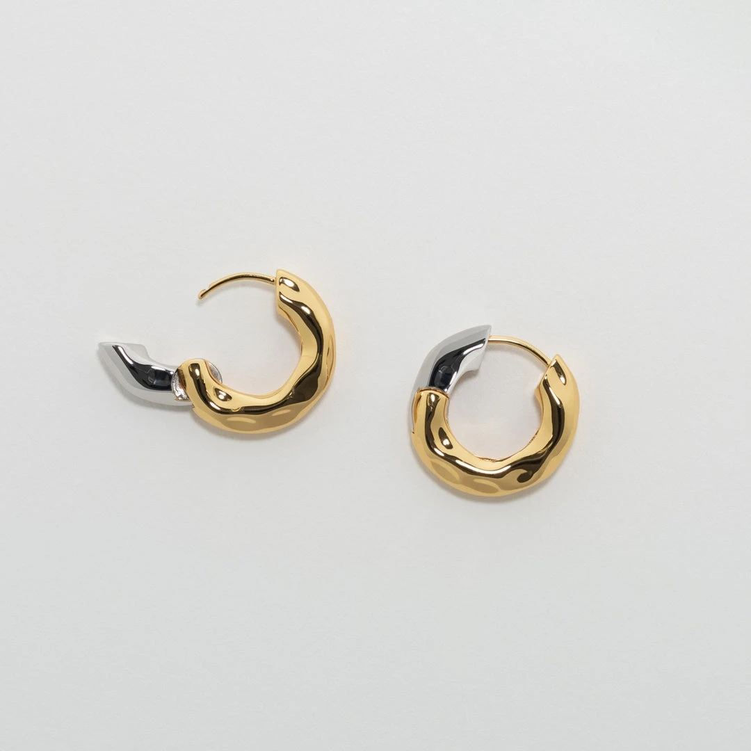- Hinge-style hoop in gold and rhodium plated recycled brass. Measures approximately 1″ in diameter. Â